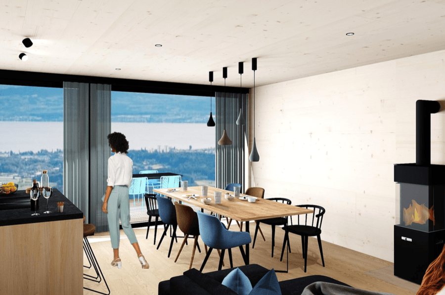 Wohnen und Genießen im Erdgeschoss, gemütliche Stunden am Kamin. Sauna und Entspannung im Obergeschoss und Freiräume für alle. Und für die Sonnenstunden sind eine weitläufige Terrasse, Garten und Naturpool bereit. .....und den See immer in Sicht.